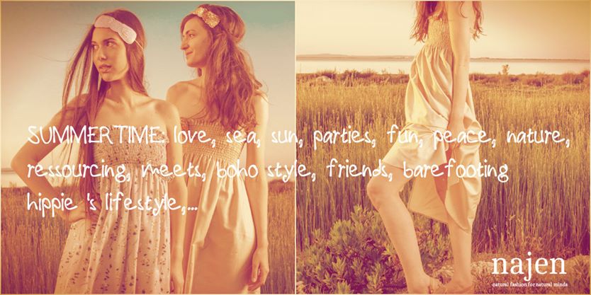 La marque de mode najen propose une ligne d’accessoires toute l’année (chapeaux, ceintures, sacs, headbands, bibis) plus une ligne de robes uniquement en été. Dans ces gammes, aucun produit synthétique n’est utilisé. Les collections sont fabriquées uniquement en lin, laine, soie, coton, cachemire, etc… De plus, les matières premières nécessaires à l’élaboration des produits najen sont fabriquées par des artisans rigoureusement choisis, et ce dans une démarche de commerce équitable.