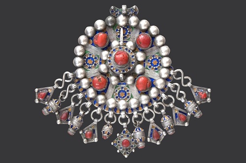 - Grande fibule circulaire tabzimt Grande Kabylie, Algérie Argent émaillé et corail, H.24 ; D.15 cm Collection Bouvier ©Marc Bouvier