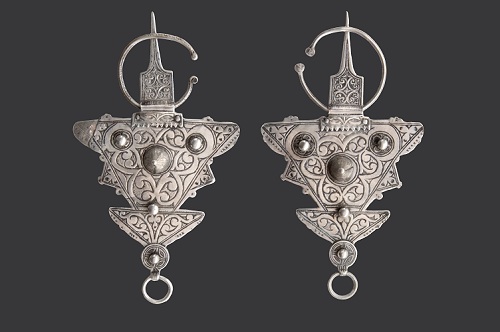 - Fibules crénelées ornées de boutons et d’un cône central Tarhjicht (région des Akhsass), Maroc, XIXe siècle, H.19 ; l.11 cm Argent ciselé Collection Bouvier ©Marc Bouvier