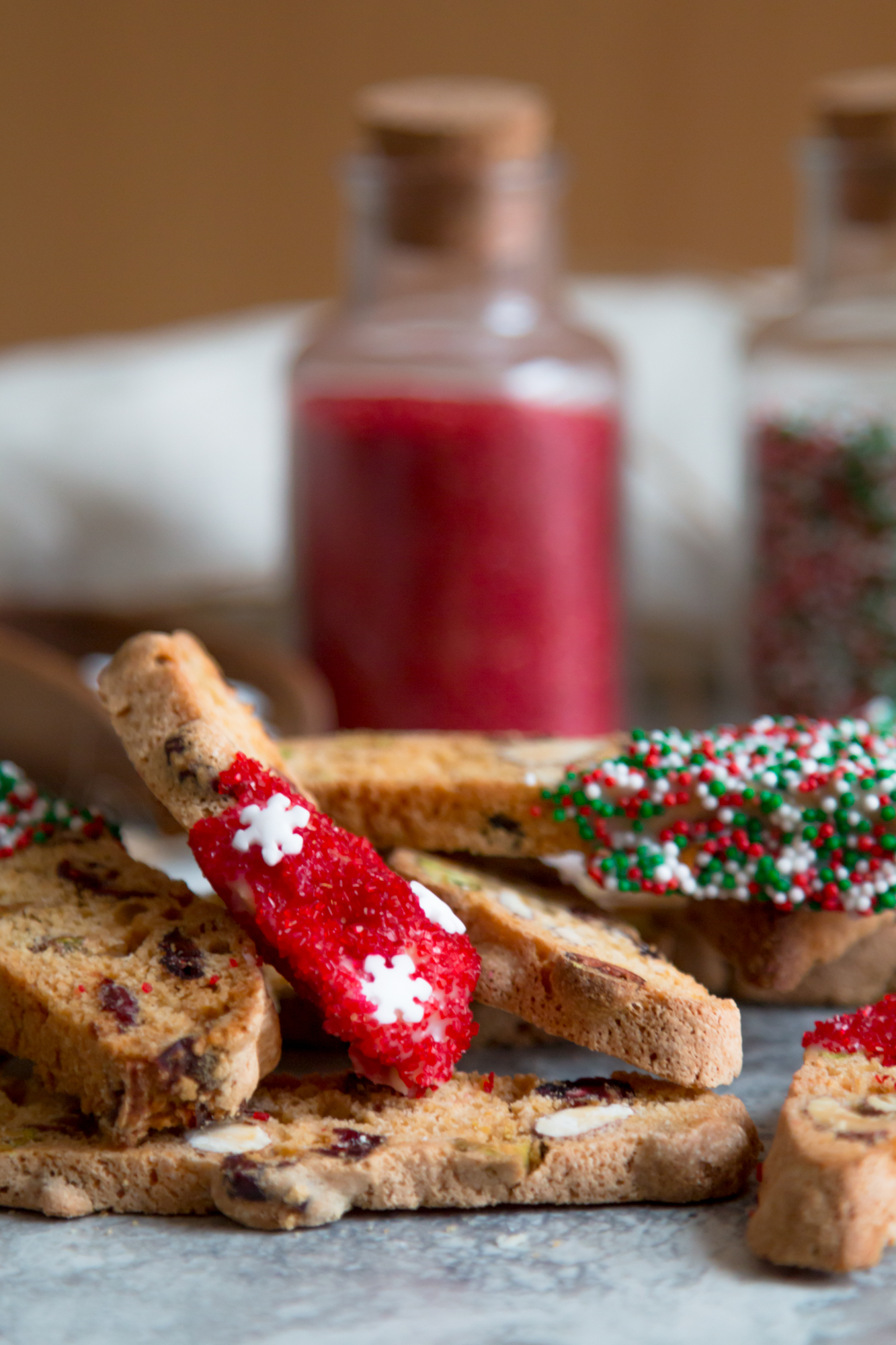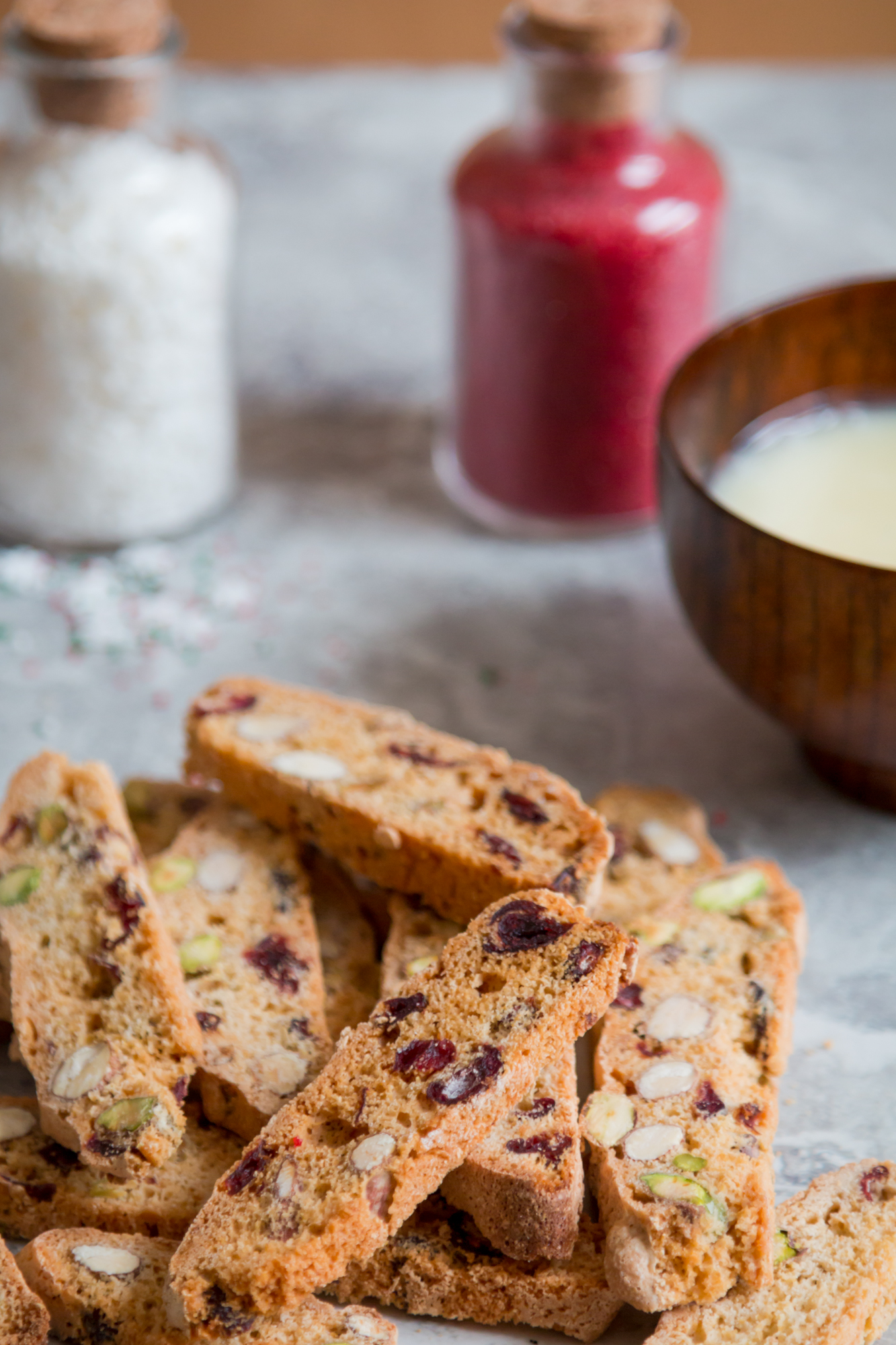 Au Maroc, nous avons aussi les biscottis. Habituellement ils sont faits avec des amandes, des raisins mais il n’y a pas de règles ! N’est-ce pas ? En cette période de fêtes de fin d’année, j’ai pensé que nous pouvons utiliser des pistaches et des canneberges séchées car non seulement cela donne aux biscottis une apparence festive mais aussi beaucoup de goût !
