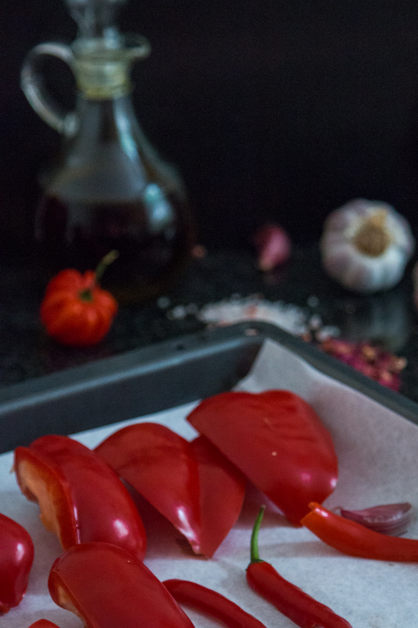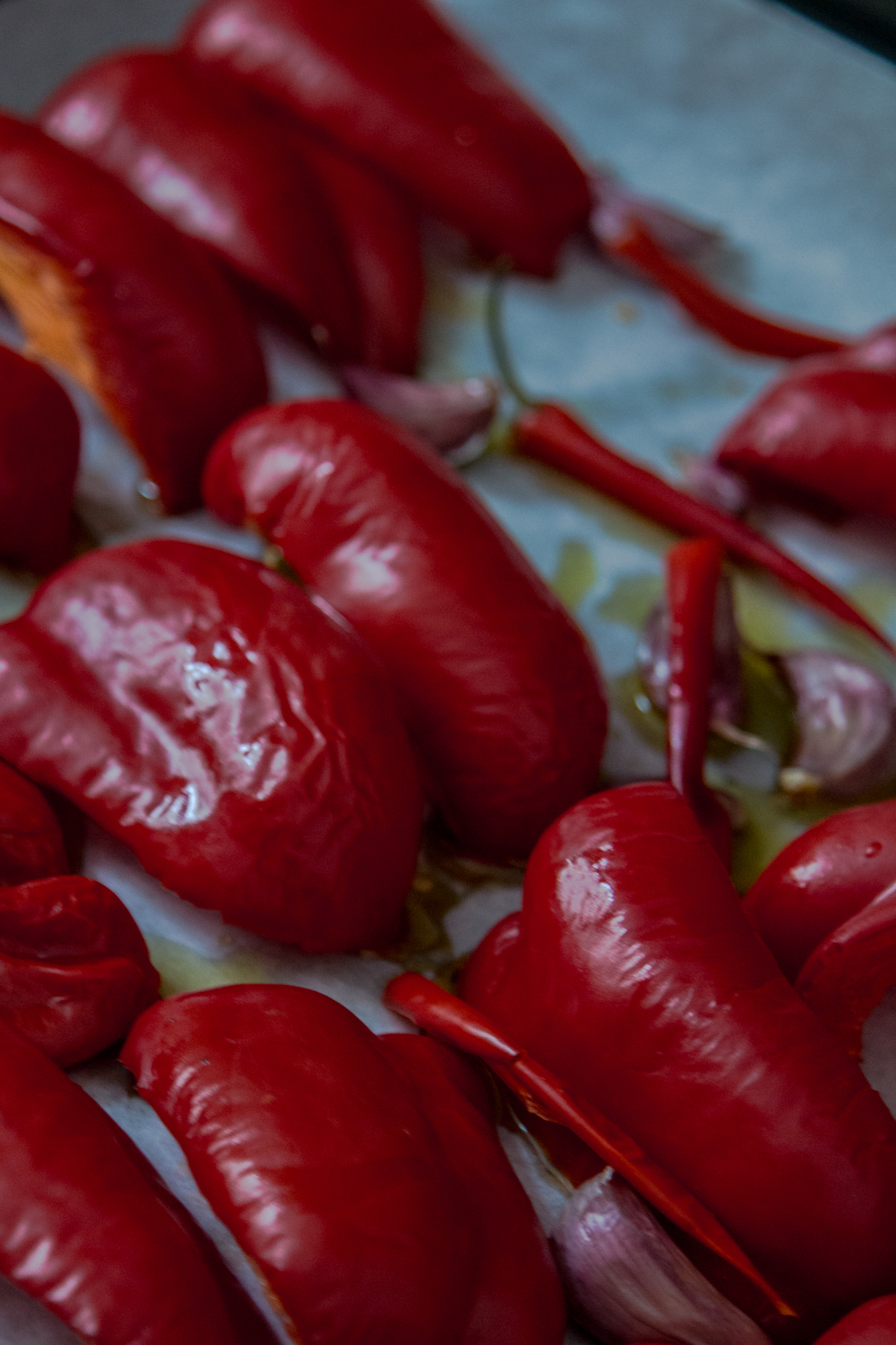 - Dans un plateau de torréfaction, placez les poivrons rouges, les piments et l’ail. Assurez-vous que la peau des poivrons soit au-dessus car nous ne voulons pas que leur peau sèche trop dans le four. Ajouter de l’huile d’olive ( 2 cuillères à soupe) et mettez le plateau dans le four chaud pendant 1 heure.