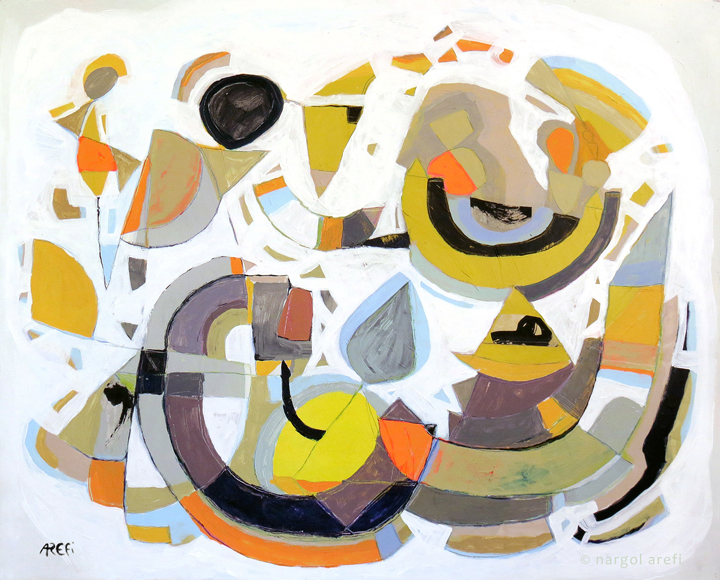 Nargol explore également son fabuleux talent avec ses peintures abstraites sur lesquelles elle aime voir les “accidents inattendus” des couleurs et des coups de pinceaux. “Je prend plus de plaisir à peindre quand je n’essaie pas de contrôler à tout prix mon médium. Ce qui m’intéresse vraiment sur une peinture, ce sont les formes imprévisibles créées par des coups de pinceaux courageux.” Elle ajoute “Quand les couleurs et les formes s’assoient les unes à côté des autres de façon imprévue, elles créent une nouveauté; celle-ci peut être faible ou forte mais c’est une nouveauté et c’est ce que j’aime.” – Nargol Arefi.