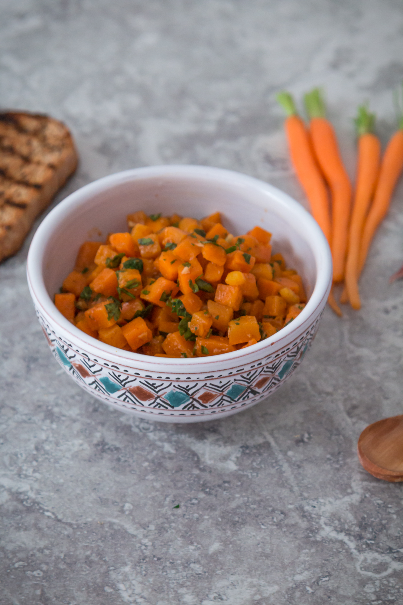 - Mélangez les carottes cuites avec la vinaigrette. Servir tiède ou froid.